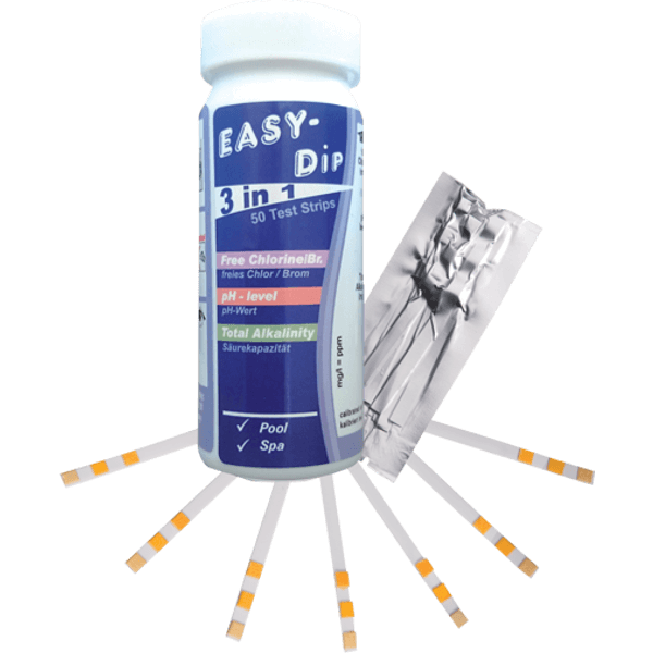 3-in-1 test strips for the measurement of pH, free Chlorine, Bromine and Alkalinity values. Each 10 of 50 strips per can are vacuum packed in foil. Number of test strips: 50 Shelf-Life in years: 3