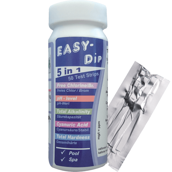 5-in-1 test strips for the measurement of pH, free Chlorine, Bromine Alkalinity, Total Hardness and Cyanic Acid values. Each 10 of the 50 strips per can are vacuum packed in foil. Number of test strips: 50 Shelf-Life in years: 3